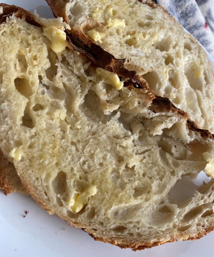 - When you remove the bread from the oven, tip it onto a cooling rack so that it can cool on all sides. Enjoy the smell (and crackling sounds) and wait until the loaf is fully cool before slicing to avoid any interior gumminess. Enjoy as you wish- we recommend with butter!